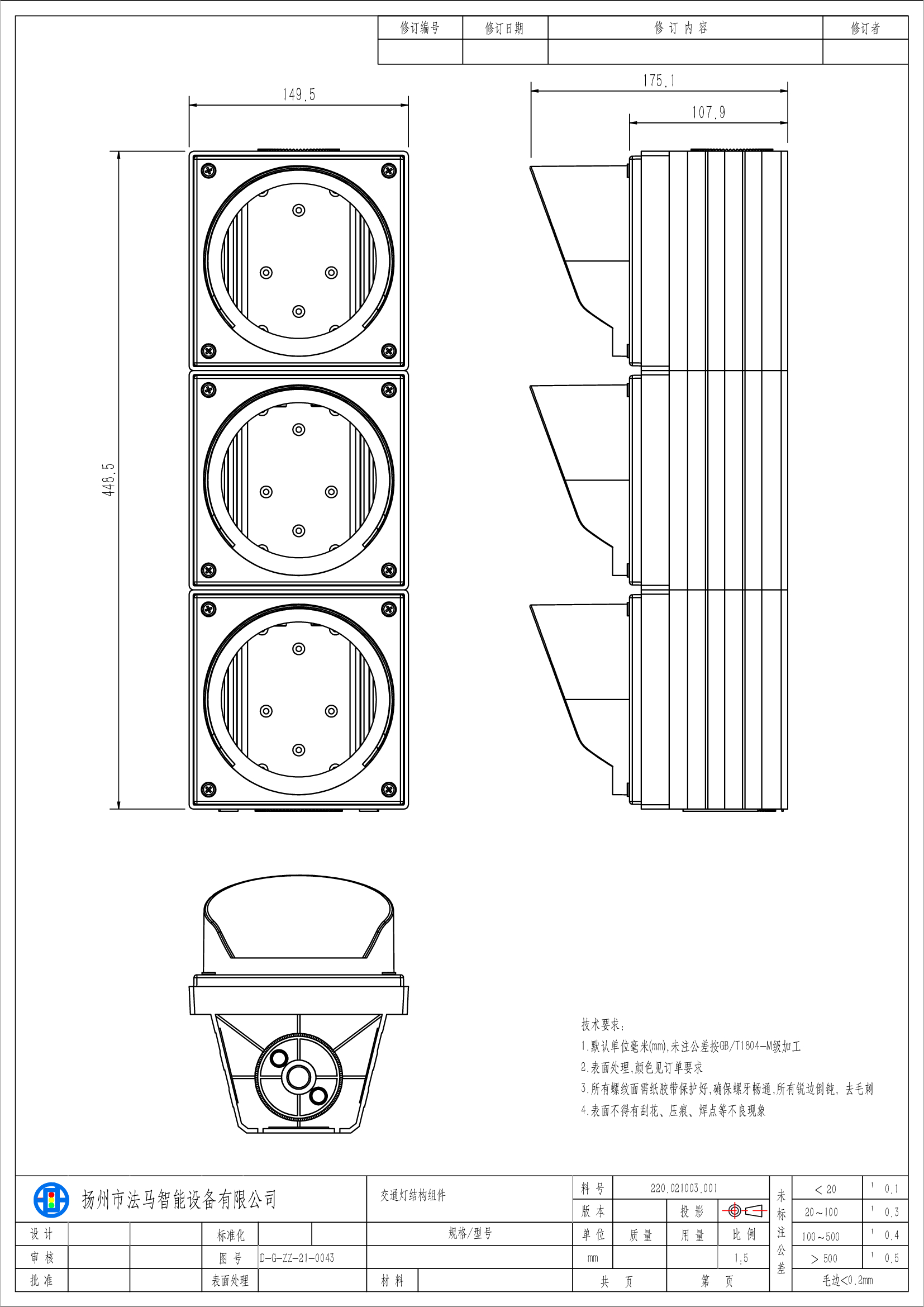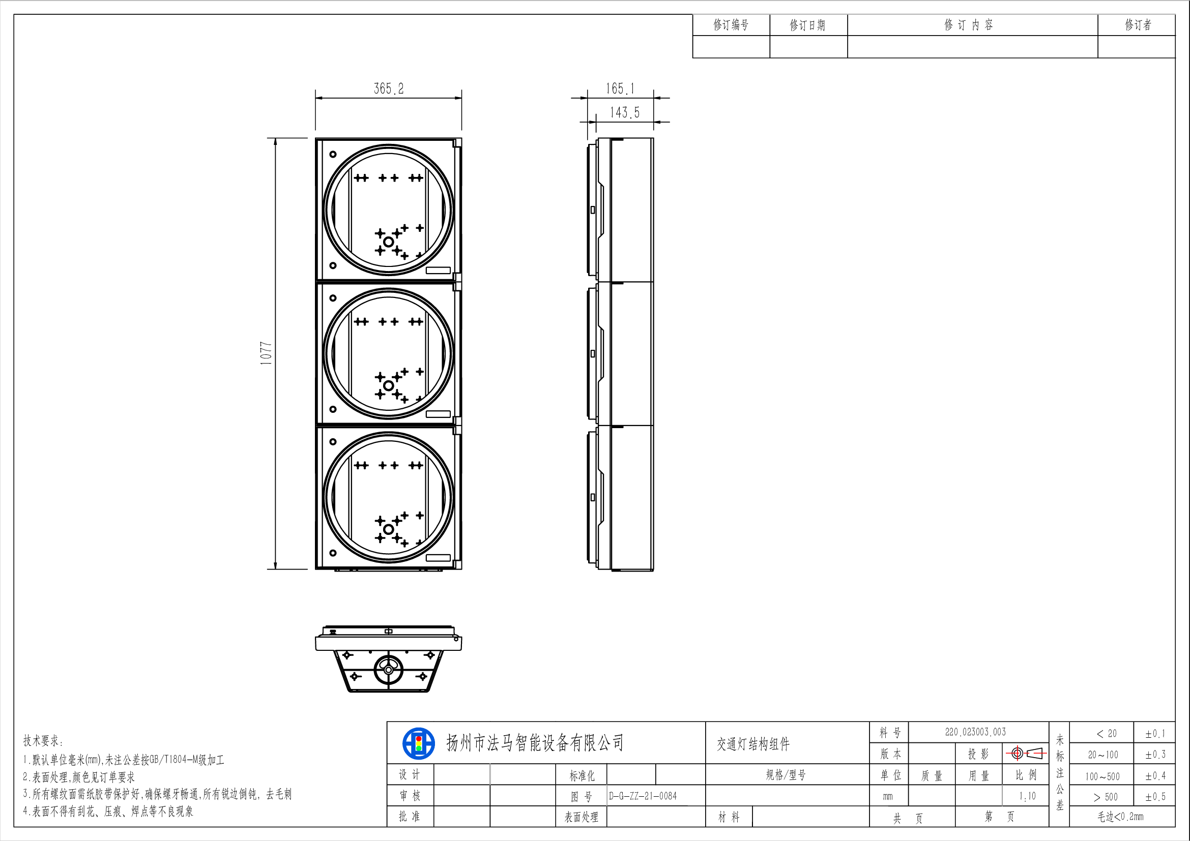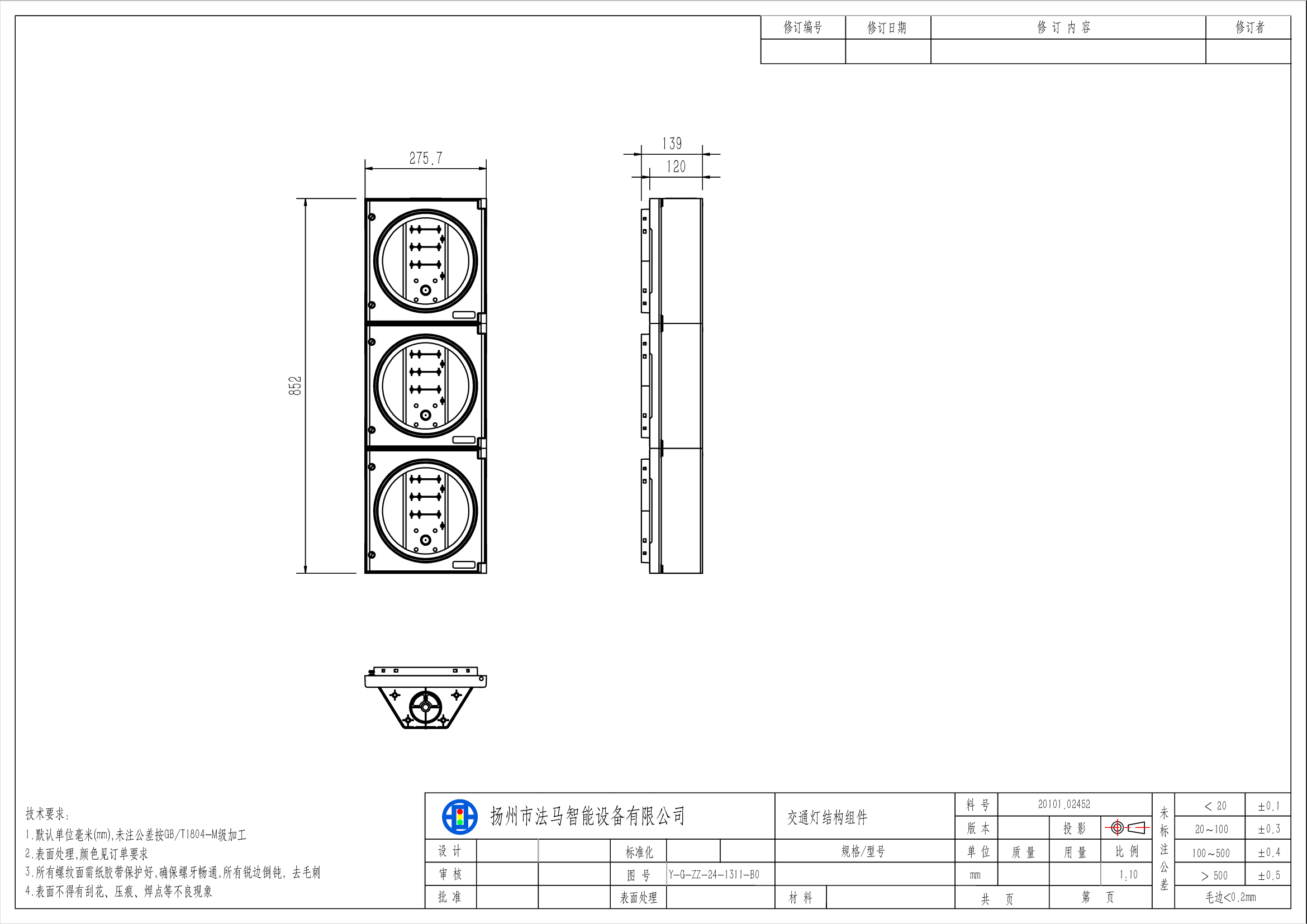ไฟจราจรทรงกลมสีแดง/เหลือง/เขียวฟลักซ์สูงประกอบด้วยชุดประกอบสามชุด แกนโคมไฟประกอบด้วยแหล่งกำเนิดแสงขนาดใหญ่ เลนส์ออปติกสามชั้น ชุดจ่ายไฟ ชามโคมไฟ และโมดูลระบายความร้อนภายนอก รวมถึงส่วนประกอบโครงสร้างอื่นๆ กลไกออปติกทำงานผ่านกระบวนการออปติกสามชั้นเพื่อเพิ่มประสิทธิภาพการส่องสว่าง กระจาย และปรับโฟกัสแสงจุดที่เปล่งออกมาจากแหล่งกำเนิดแสง ทำให้เกิดแสงที่ส่องบนพื้นผิวสม่ำเสมอ สามารถนำไปประยุกต์ใช้กับทางแยกควบคุมสัญญาณไฟจราจรได้หลากหลายประเภท